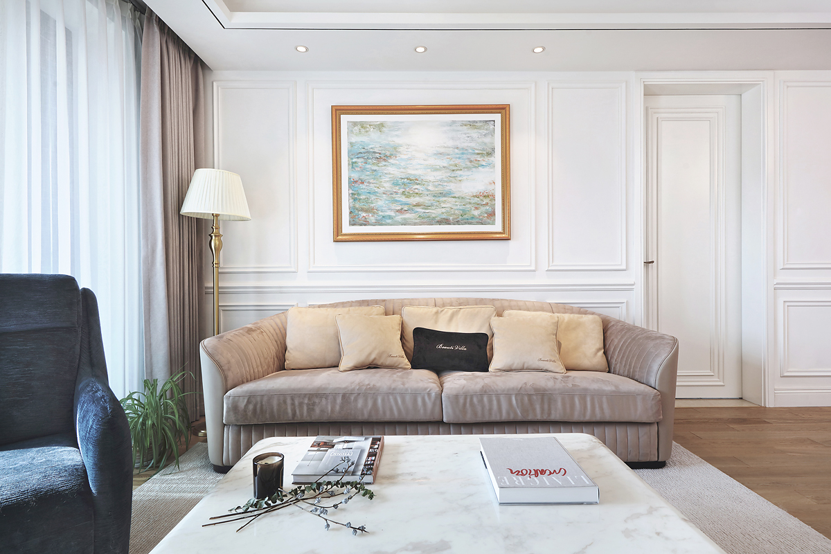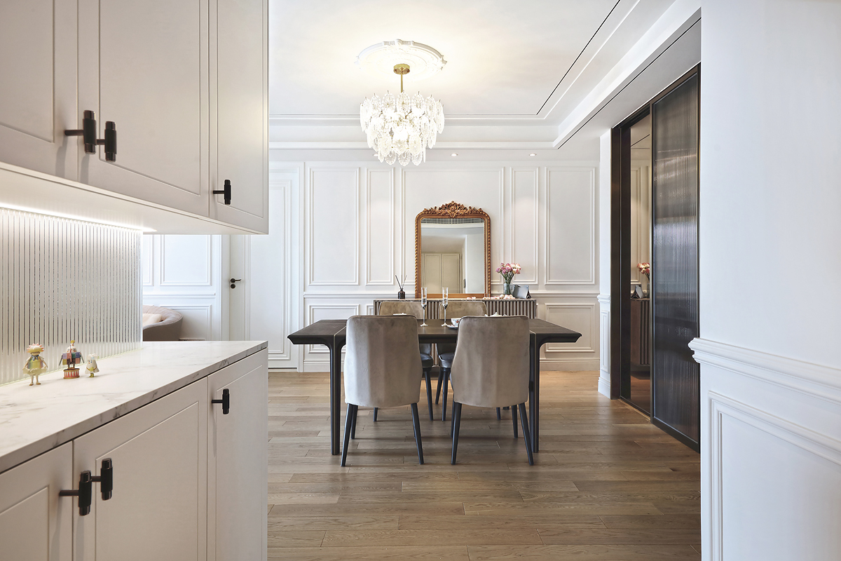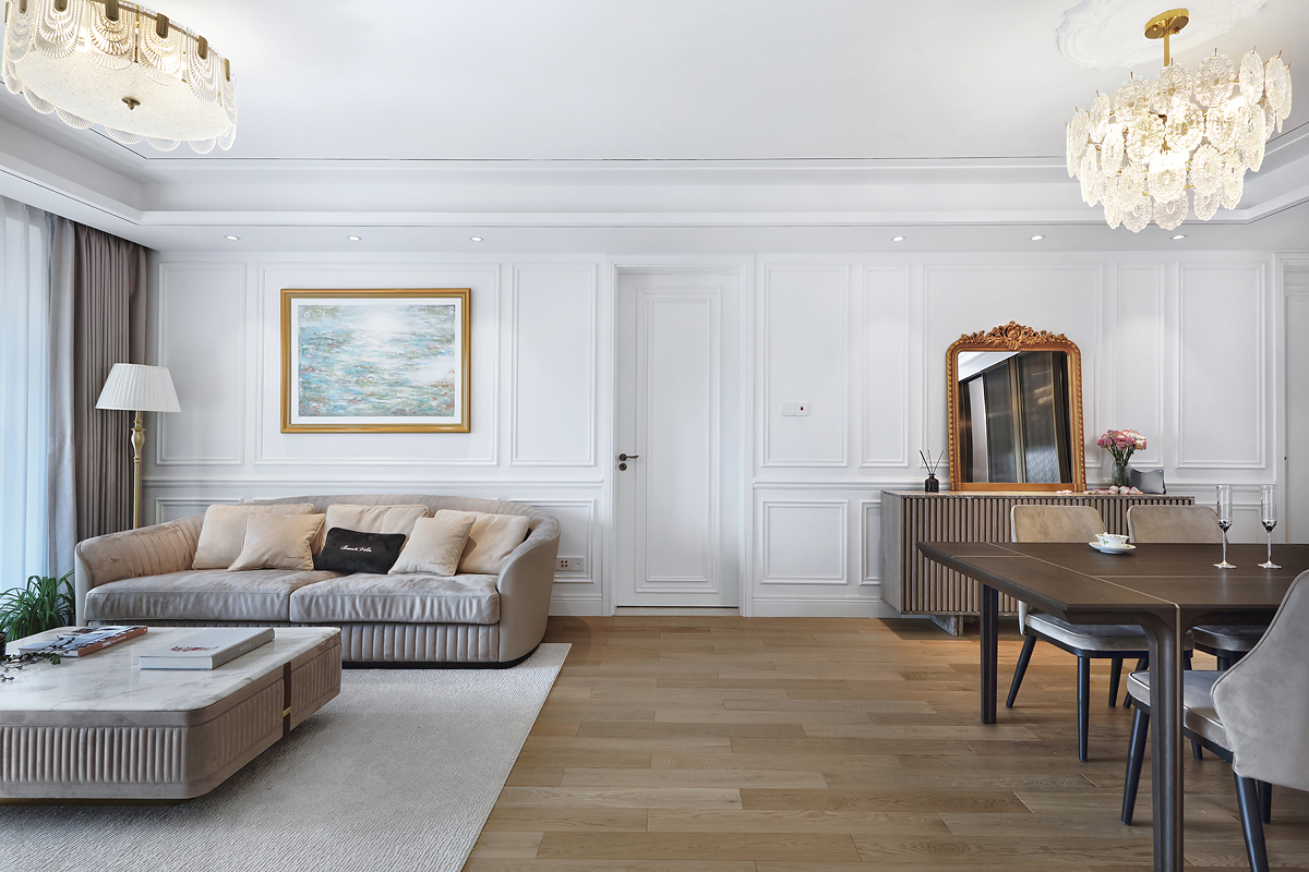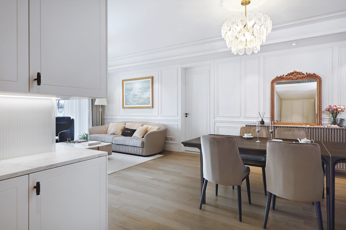 The original dark wooden floors and yellowed paint of the pre-installed house were removed, and the space was based on pure white to reflect the young couple's romantic taste for French light luxury.