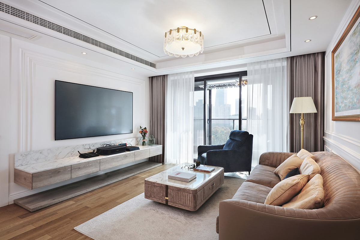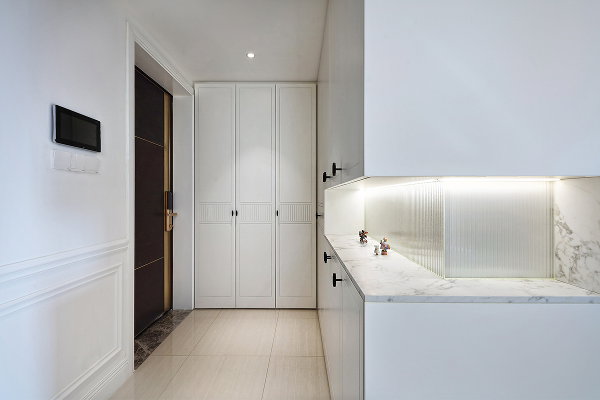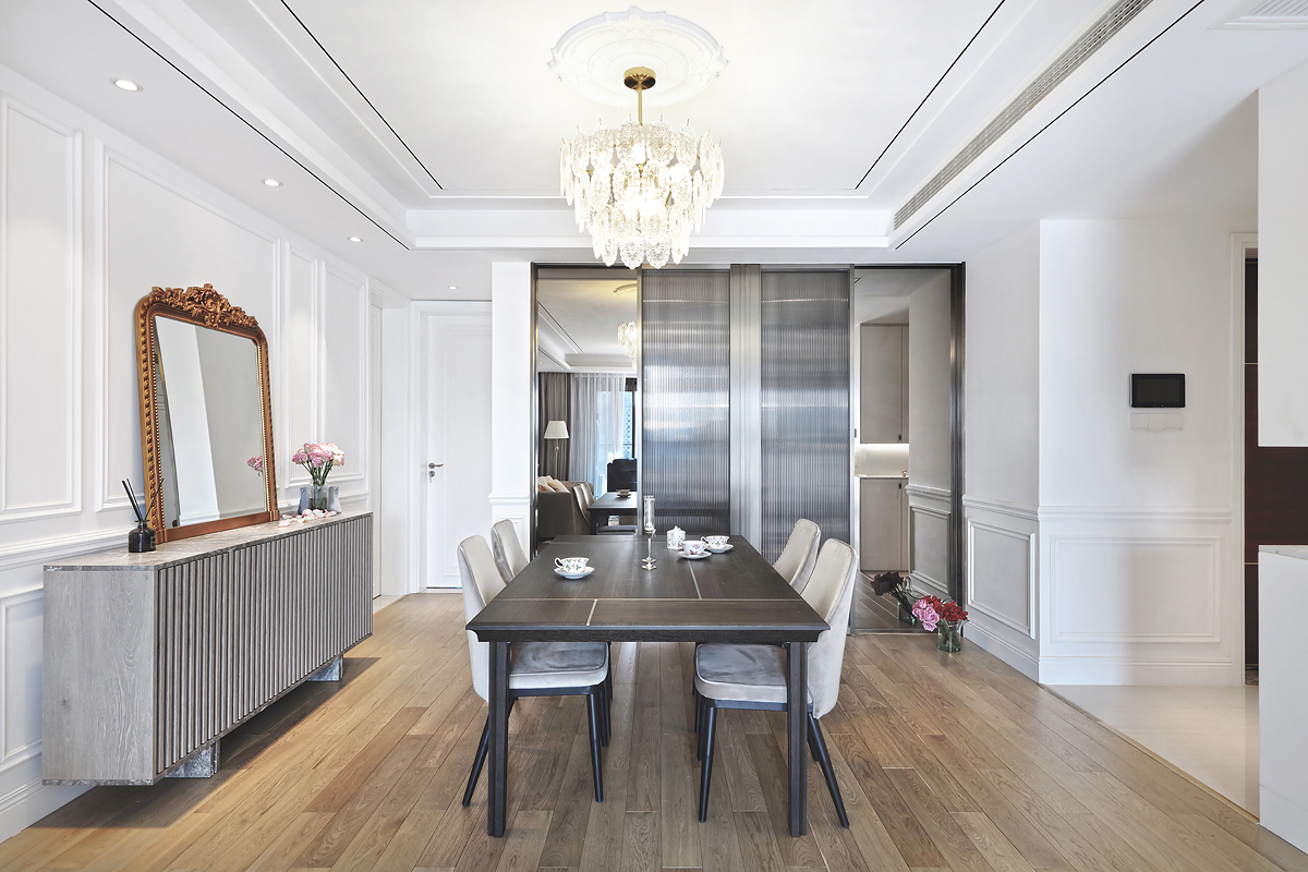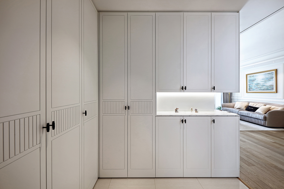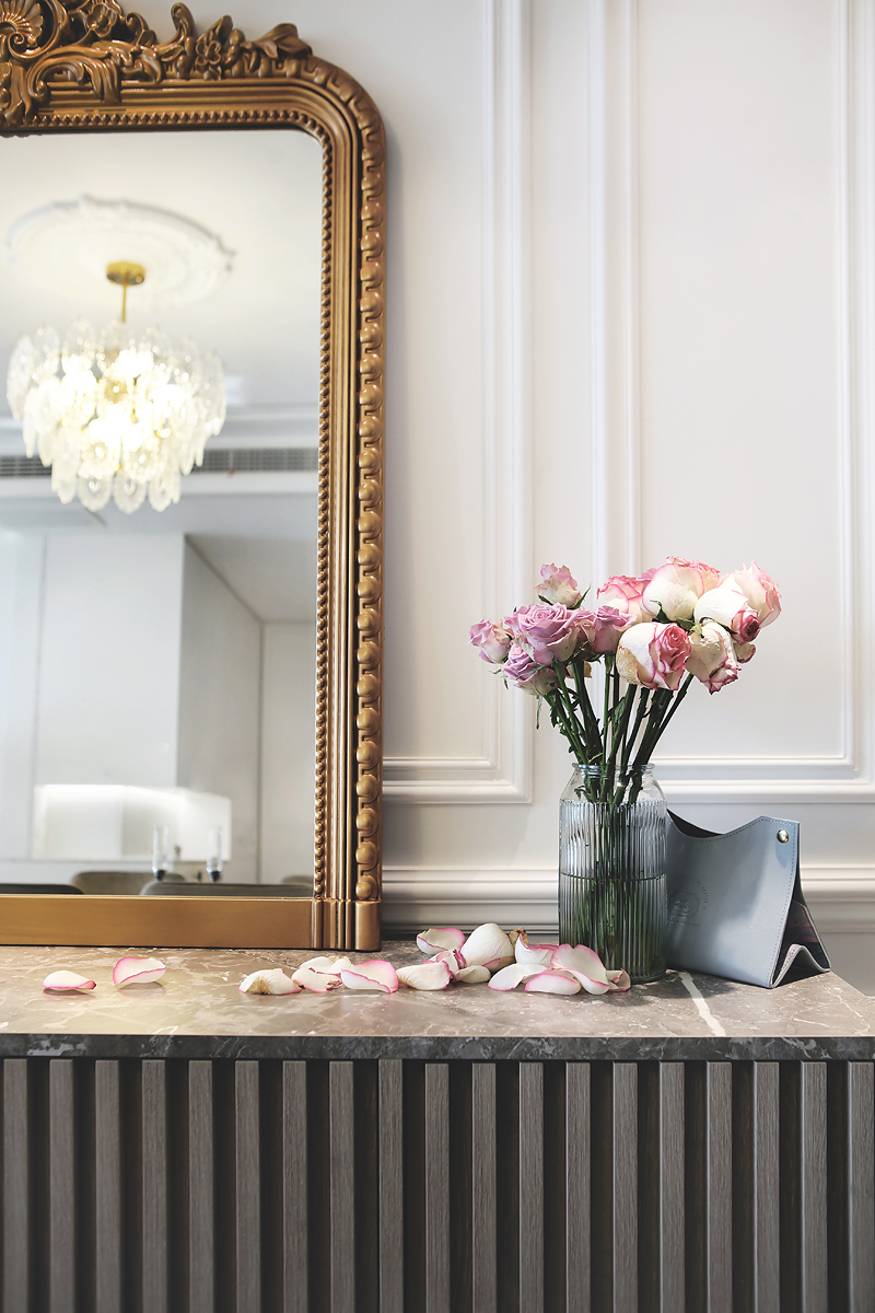 The original dark wooden floors and yellowed paint of the pre-installed house were removed, and the space was based on pure white to reflect the young couple's romantic taste for French light luxury.