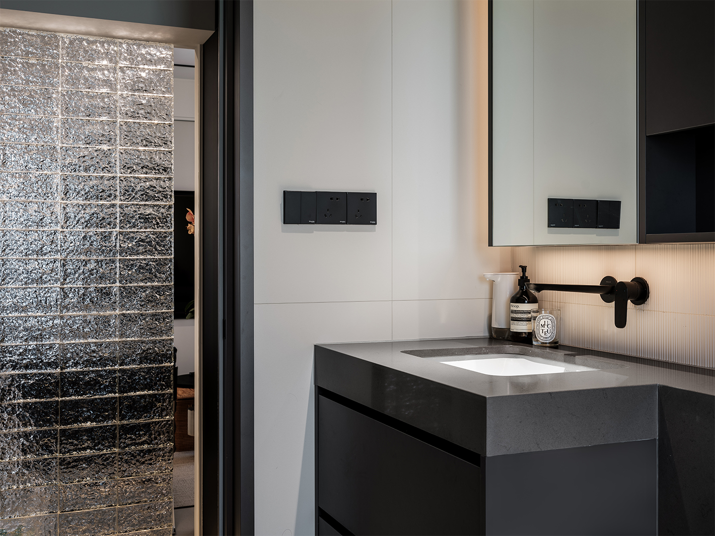 The public area is both defined and constrained by two existing beams on either side of the living room and a small window opening for natural light. The design carefully rearranges the furniture layout turning the sofa so that it sits parallel to the window, giving more space to the living area. This arrangement also allows natural light to penetrate deeper and to filter through the glass brick wall creating light refractions as well as a sense of dynamic layering in the interior spaces.