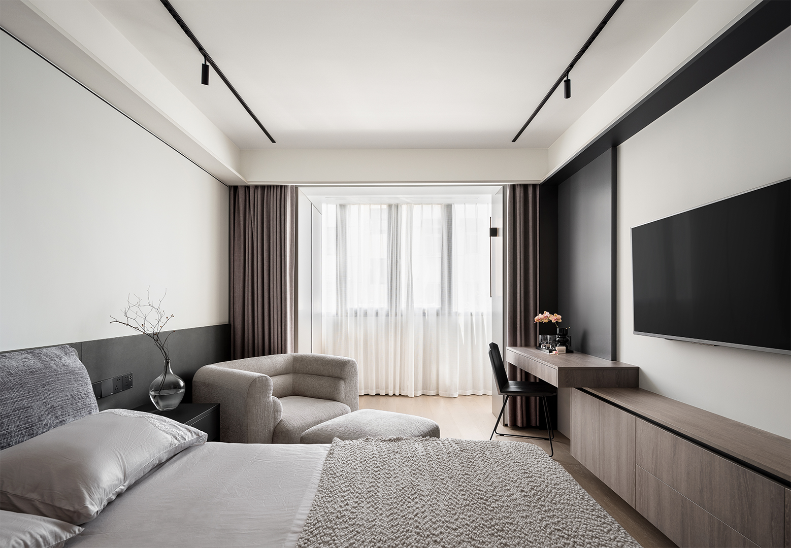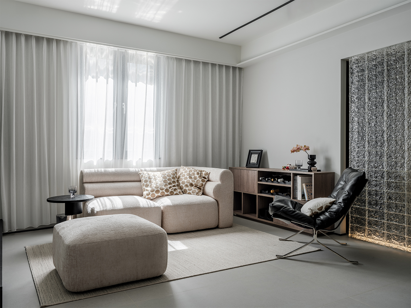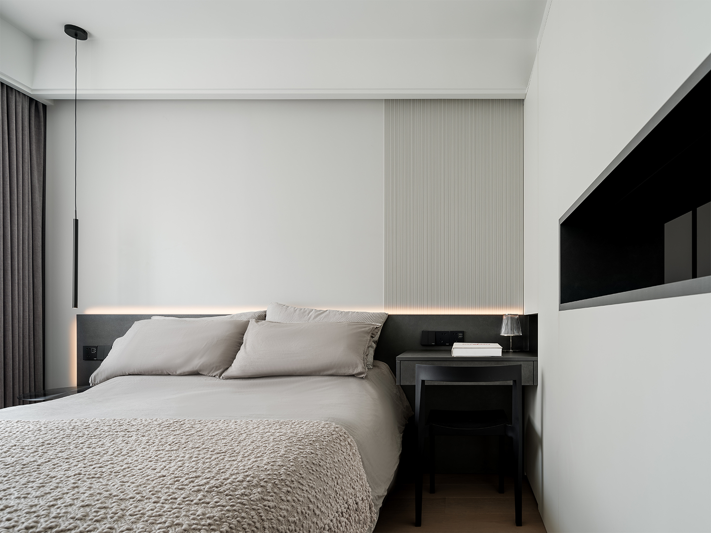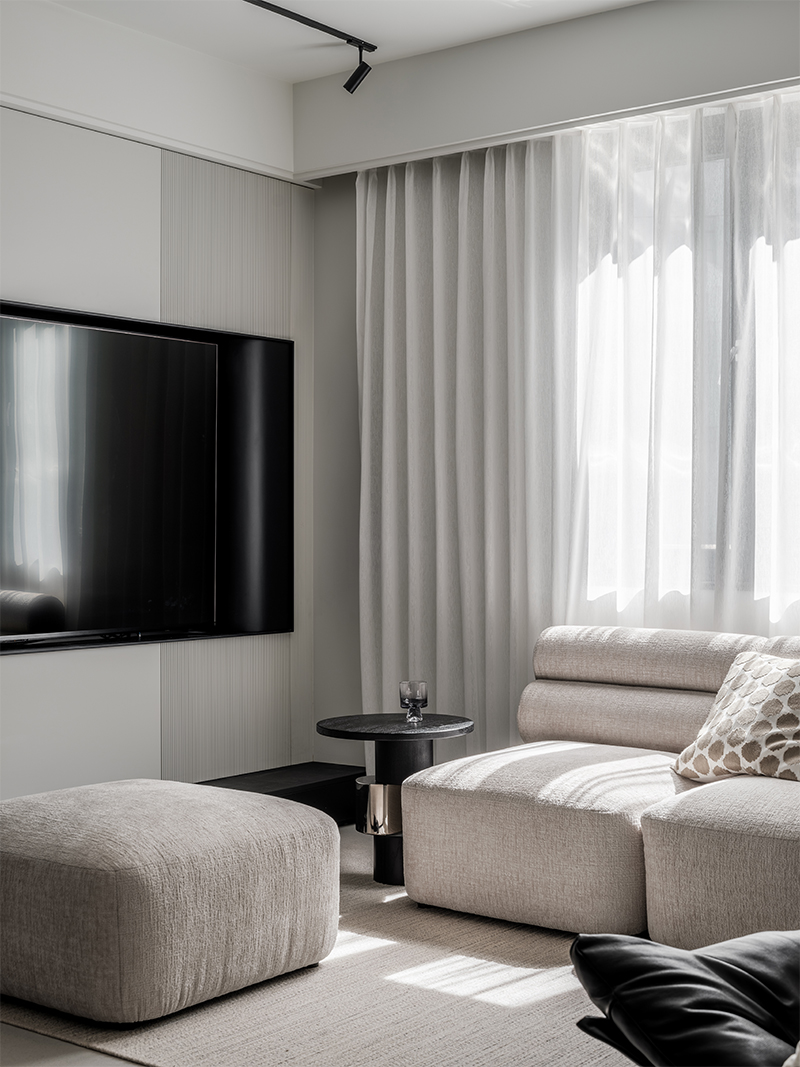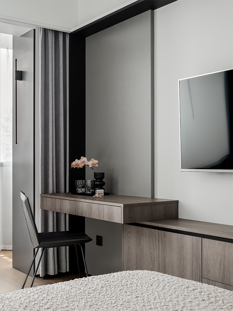 Under one of the existing beams, we extended the TV wall into a larger curvilinear volume that subsumes the concealed bedroom doors and MEP equipment placements. The volume acts as a threshold softening the transition between living room and bedroom as well as between the entrance foyer and living area. The use of floor-to-ceiling wood and textured lacquer panels aims to create an elevated sense of vertical spatial extension in the living room, whilst giving detail and elegance to the space.