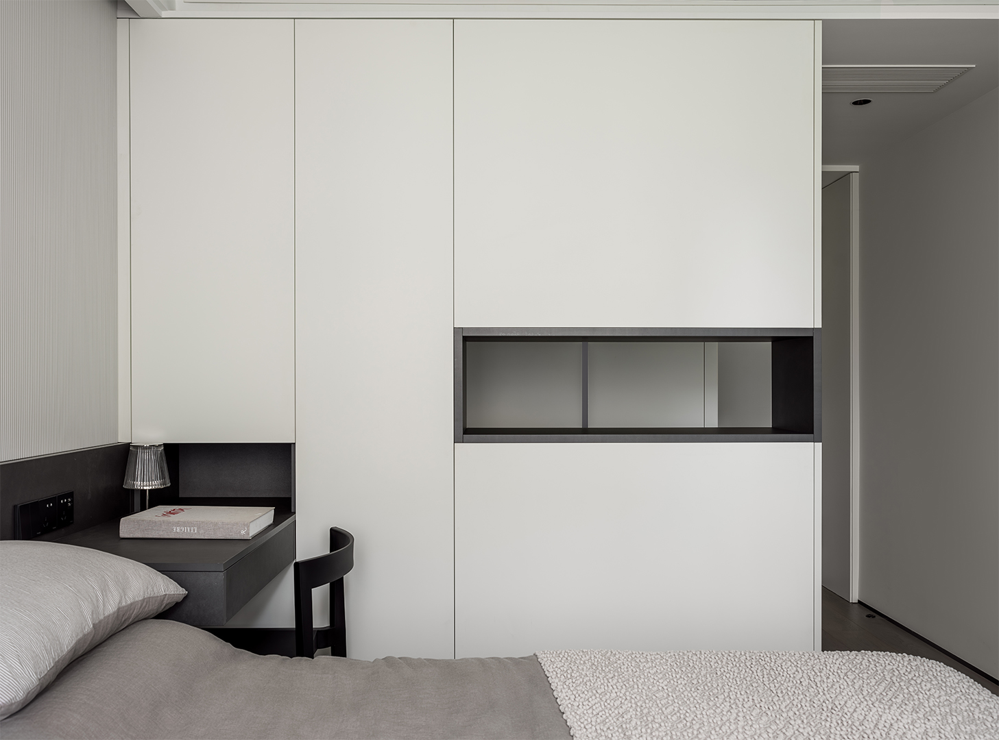 Inside the bedrooms there are extensive built-in storage spaces in the sleeping areas, as well as a separate walk-in wardrobe. The walk-in wardrobe is finished entirely in white with the exception of a black framed opening which acts as a point of interest, offering a visual connection from the room into the clean and airy walk-in wardrobe.